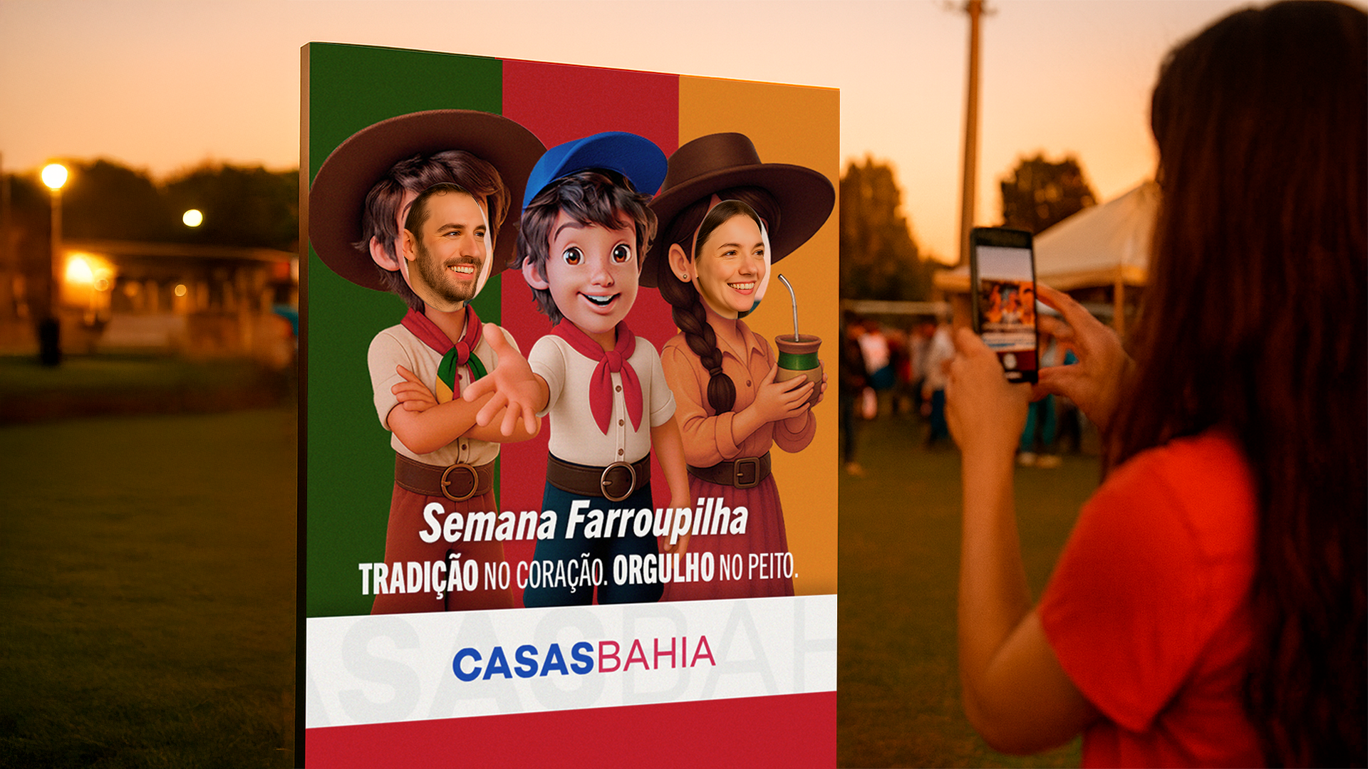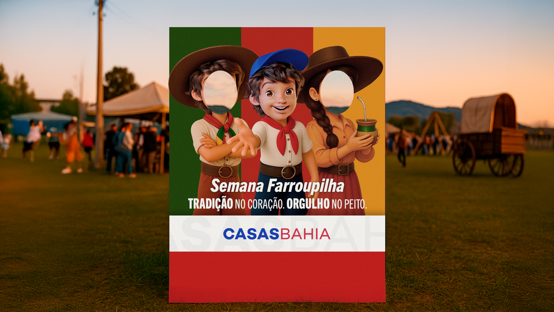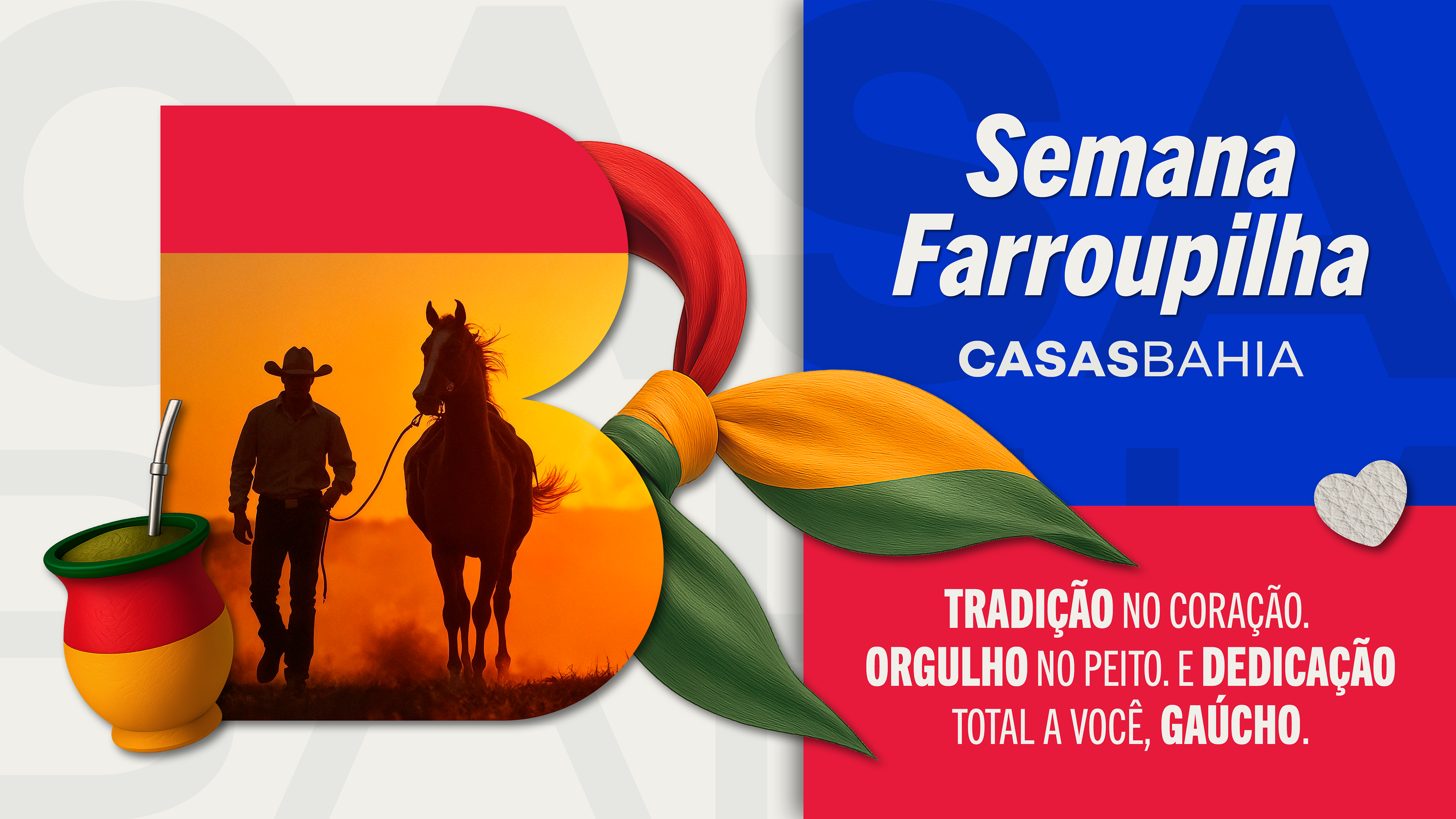 Para a Semana Farroupilha, o objetivo foi criar uma peça que transmitisse a força, a identidade e o orgulho da cultura gaúcha, dialogando diretamente com o público do Rio Grande do Sul. Vai muito além de uma comemoração: ela é um marco de pertencimento e tradição, celebrado com intensidade em cada detalhe — das vestes típicas ao chimarrão.
