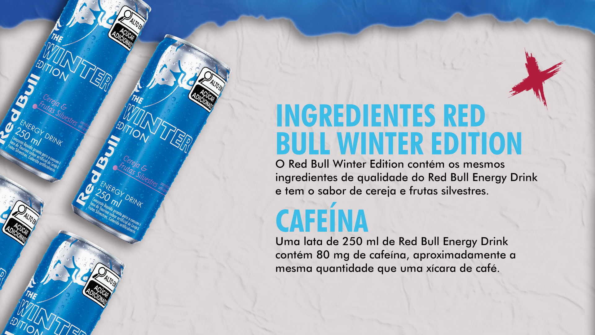 A Red Bull Winter Edition – Sabor Cereja e Frutas Silvestres é uma edição limitada criada para o inverno, que combina o já conhecido impulso energético da marca com o sabor marcante da cereja e o frescor das frutas silvestres, trazendo energia e vitalidade para a estação mais fria do ano.